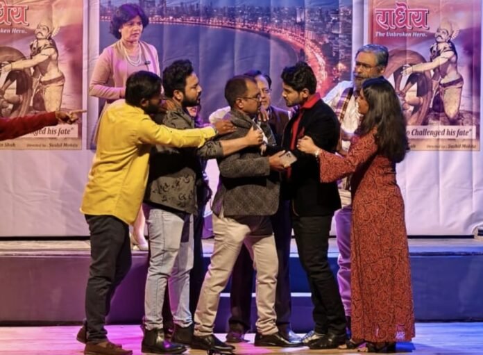महाभारतातील कर्ण, कृष्ण व अर्जुन यांच्यातील युद्धाच्या प्रसंगाने नाटकाचा पडदा उघडतो. ‘राधेय’ या AI-निर्मित चित्रपटातील एक प्रसंग असल्याचे नंतर उलगडते. धर्म–अधर्म, नैतिकता व त्यातील ‘सोयीस्कर अर्थ’ यावर केलेले भाष्य प्रेक्षकांना गुंतवून ठेवते. तब्बल ९०० कोटींची कमाई करणारा या सिनेमाचा निर्माता जतीन शाहच्या यशकथा, मीडिया मुलाखती, ग्लॅमरस सक्सेस पार्टीतून नाटकाचा पहिला अंक पुढे सरकतो. अभिनेता अभिजीत, कला-दिग्दर्शक सुहास यांच्या आत्महत्येस शाहला कारणीभूत ठरवतो. त्या क्षणी नाटक मर्डर मिस्ट्रीच्या दिशेने जात असल्याचे जाणवते.