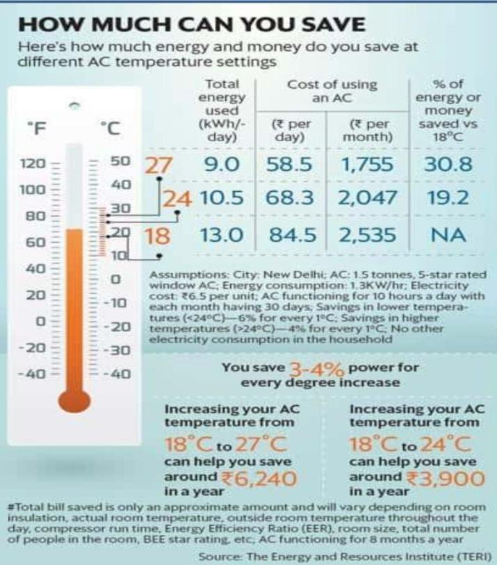 1) ए.सी. चे तापमान २४°C ते २६°C दरम्यानच ठेवावे आणि सापेक्ष आर्द्रता ५५% ते ६५% दरम्यान ठेवा. या सेटिंग्जवर ए.सी. किमितकमी वीज वापरण्यासाठी डिझाइन केलेले आहेत. तसेच ही सेटिंग्ज मानवी शरीरासाठी सर्वाधिक आरामदायी वातावरण लक्षात घेवून डिझाइन केली गेली आहेत.