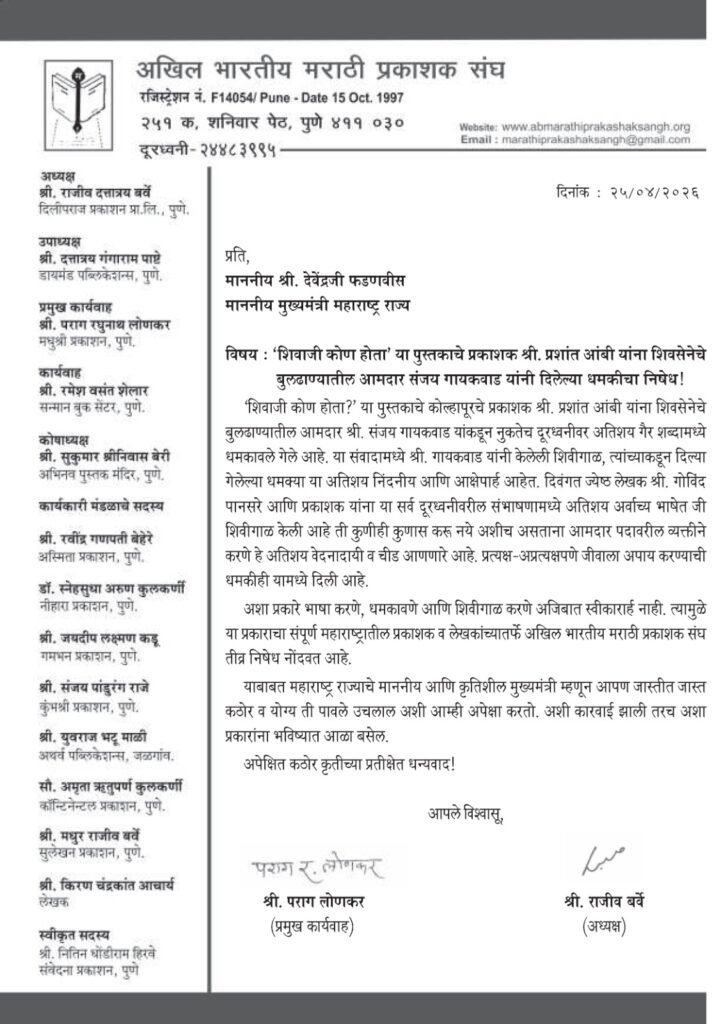 ‘शिवाजी कोण होता’ या पुस्तकाचे प्रकाशक श्री. प्रशांत आंबी यांना शिवसेनेचे बुलढाण्यातील आमदार संजय गायकवाड यांनी दिलेल्या धमकीचा तीव्र शब्दात निषेध करून, त्यांच्यावर जास्तीत जास्त कठोर कारवाई करण्यात यावी, अशी अखिल भारतीय मागणी मराठी प्रकाशक संघाने मुख्यमंत्री श्री. देवेंद्र फडणवीस यांना पाठविलेल्या निवेदनाद्वारे केली आहे.