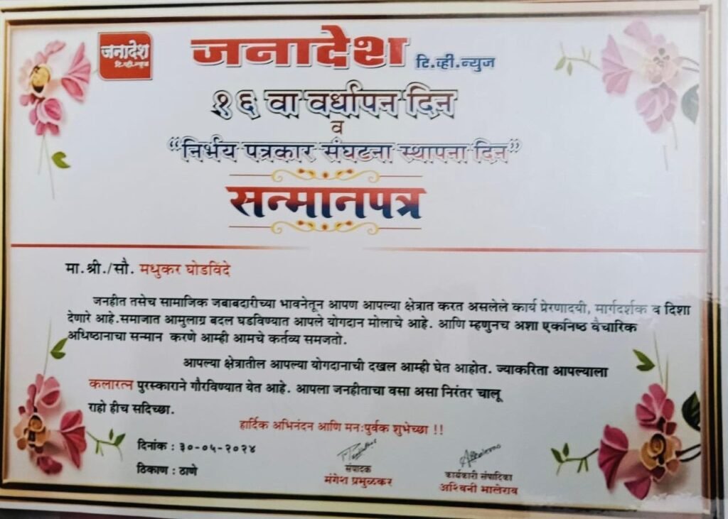 मधुकरजी गायक, गाण शिक्षक आहेत. तर त्यांच्या सहचारिणी सौ मीना घोडविंदे या लेखिका, कवयित्री म्हणुन प्रसिद्ध आहे. अतिशय निष्ठेने परिचारिकेची सेवा बजाविलेल्या मीनाताईंचीही प्रेरणादायी जीवन कथा मी या पूर्वी शब्दबद्ध केली आहे. हे दोघेही एकमेकांना समजून घेऊन, घराची कर्तव्ये, जबाबदार्या पार पाडून आपापल्या कला जोपासत, एकमेकांना छान साथ संगत करीत जीवन जगत आले आहेत. आजकाल बारीकसारीक कारणांनी घटस्फोट घेऊन स्वतःच्या आणि प्रसंगी आपल्या मुलांच्या जीवनाची वाट लावत चाललेल्या, आपापल्या आई वडिलांना मनस्ताप देणार्या जोडप्यांनी त्यांच्याकडे पाहून हे शिकले पाहिजे की, पतीपत्नी हे एकमेकांचे स्पर्धक नसतात तर एकमेकांना पूरक ठरूनच ते स्वतःची आणि आपल्या मुलाबाळांची प्रगती साधू शकतात. समाजात मान, मान्यता मिळवू शकतात.