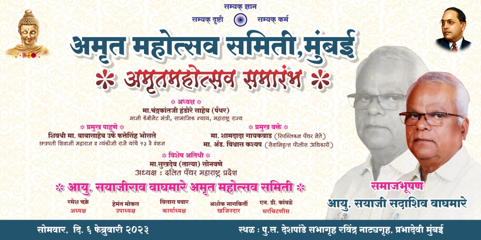 ज्येष्ठ समाजसेवक, लेखक, नामांतर आंदोलनातील लढ्वैये नेते, महाराष्ट्र शासनाचे समाजभूषण पुरस्कार प्राप्त, सेवानिवृत्त विक्रीकर अधिकारी सयाजीराव वाघमारे यांच्या अमृतमहोत्सवी वर्षानिमित्त आज, सोमवार दि. ६ फेब्रुवारी २०२३ रोजी मुंबईतील रवींद्र नाट्य मंदिरात अभिष्टचिंतन सोहोळा आयोजित करण्यात आला आहे. त्यानिमित्त त्यांच्याशी केलेली ही बातचित.
