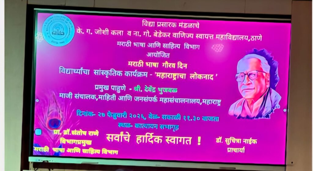 धर्माच्या नावाखाली भारताची फाळणी होऊन पाकिस्तान अस्तित्वात आले. पण त्याच पाकिस्तानची भाषेच्या आधारावर फाळणी होऊन बांगला देश अस्तित्वात आला. यावरुन मानवी जीवनात मातृभाषेचे महत्व किती आहे हे स्पष्ट होते, असे प्रतिपादन निवृत्त माहिती संचालक श्री देवेंद्र भुजबळ यांनी केले. ठाणे येथील जोशी बेडेकर महाविद्यालयात २७ फेब्रुवारी रोजी आयोजित करण्यात आलेल्या मराठी भाषा गौरव दिनाच्या कार्यक्रमात ते प्रमुख पाहुणे म्हणून बोलत होते.