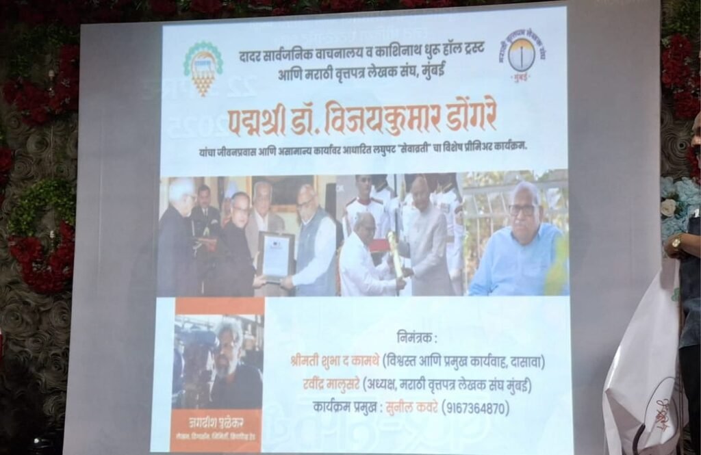 “रुग्णसेवा हीच खरी ईश्वर सेवा” असे मानणाऱ्या आणि अनेक दशकं ग्रामीण व शहरी कुष्टरोग निवारण आणि रुग्णसेवेसाठी झटणारे, देशा-परदेशात कॉन्फरन्समध्ये सहभागी होणारे व या विषयावरील ६० पुस्तकांचे लेखक पद्मश्री डॉ. विजयकुमार डोंगरे यांचा जीवनप्रवास आणि असामान्य कार्यावर आधारित असा हा ३५ मिनिटांचा “सेवाव्रती” माहितीपट आहे. त्याचा विशेष प्रीमियर शो दादर सार्वजनिक वाचनालय आणि काशिनाथ धुरु हॉल ट्रस्ट व मराठी वृत्तपत्र लेखक संघ मुंबई यांच्या संयुक्त वतीने नुकताच निमंत्रितांसाठी आयोजित केला होता.