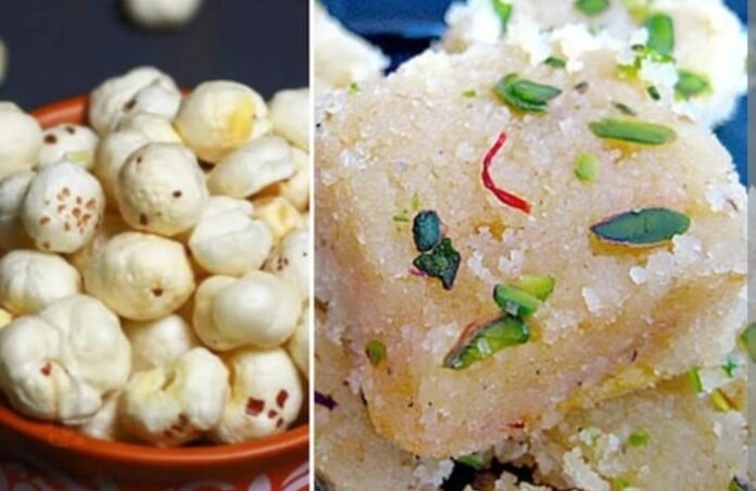 1 वाटी साबुदाणा, 2 वाट्या मखाणे, सव्वा वाटी साखर, अर्धी वाटी दुध, पाव वाटी कंडेन्स्ड मिल्क, पाव वाटी फ्रेशक्रिम किंवा मलाई, 1 चमचा वेलचीपूड, पाव वाटी काजू, बदाम, पिस्ते यांचे काप, केशर .. असल्यास, 2 चमचे साजूक तूप.