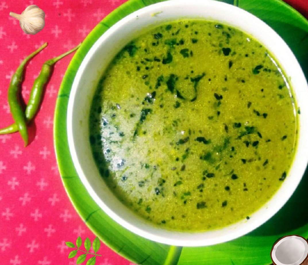 सर्वांत आधी आपण वाटण बनवू. त्यासाठी मिक्सर मध्ये शेंगदाणे, ओवा, तीळ, खोबरे, मिरची, निम्मी कोथिंबीर, लसूण, मिरच्या घालून छान वाटून घ्यावे. मग गॅसवर पातेल्यात पाणी गरम करण्यास ठेवावे. दुसरीकडे कढई ठेवून त्यात तेल घालून मोहरी, जिरे, कढीपत्ता, हिंग, हळद घालून खमंग फोडणी करून त्यात मिक्सर मध्ये बनवलेले वाटण घालून छान परतावे. म्हणजे शेंगदाणे, खोबरे, तीळ यांचा कच्चेपणा जाऊन त्यांना तेल सुटेल व खमंग स्वाद येईल. मग घट्टसर, पातळ जसे आवडेल त्याप्रमाणे गरम पाणी घालावे व चवीनुसार मीठ व कोथिंबीर घालून छान उकळी द्यावी व मग गॅस एकदम मंद करून ठेवावा. मधून मधून बुडातून ढवळावे म्हणजे बुडाला लागणार नाही आणि तेलाचा छान तवंग वर दिसेल. पोपटी हिरवा रंग खूप छान दिसतो. पाहूनच खाण्याचा मोह अनावर होतो. हे गरम गरम सर्व्हिंग बाऊल मध्ये काढून भात, पोळी, भाकरी यांच्यायासोबत सर्व्ह करावे. जोडीला कांदा, लोणचे असले की बस्स !