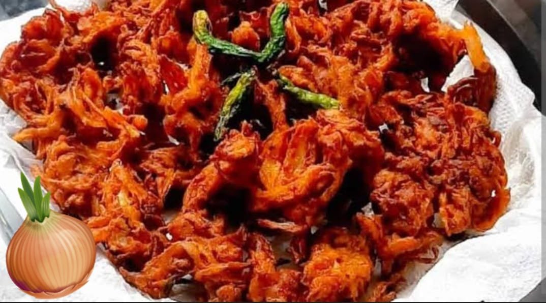 मस्त गरम झालेल्या अशा तेलात भजी पसरून सोडावीत. त्यामुळे ती सुटीसुटी, लांब लांब कांदा असल्यामुळे लांबट, कुरकुरीत बनतात. ही मस्त लालसर रंगावर तळून तारेच्या मोठ्या खोलगट झाऱ्याने पूर्ण तेल निथळून तारेच्या पसरट चाळणीत काढावीत आणि गरम गरम भजी सर्व्ह करावीत.