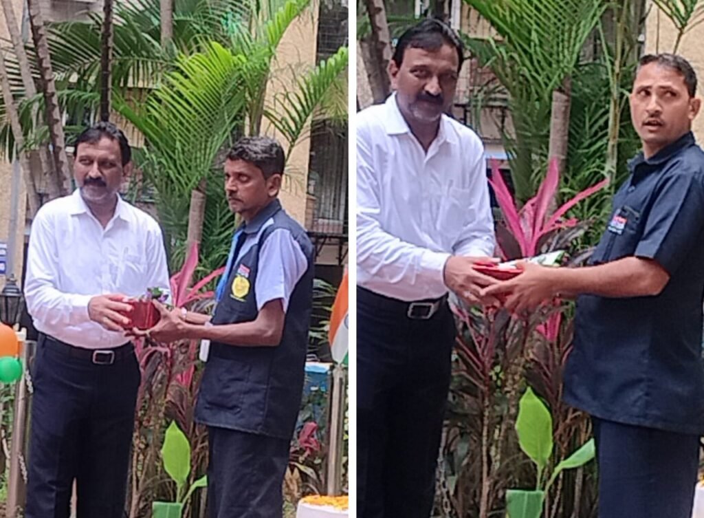 यावेळी भरपूर पैसे असलेले, सापडलेले पाकिट प्रामाणिकपणे संबंधितास नेऊन दिल्याबद्दल सफाई कर्मचारी श्री.विनोद डाकलिया याचा तर समयसूचकता दाखवून बंद पडलेल्या लिफ्ट मधून बालकांची सुखरूप सुटका केल्याबद्दल सुरक्षा पर्यावेक्षक श्री.विनोद यादव यांचा भेटवस्तू आणि गुलाबपुष्प देऊन सत्कार करण्यात आला.